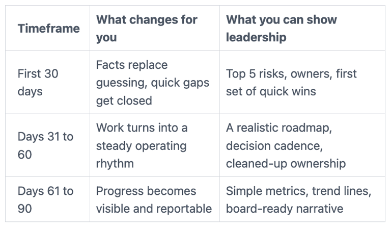 By day 30, you should be able to tell the CEO and board: "Here are the top five risks from our initial risk assessment, what they mean in business impact, what we're doing now, and what decisions we need."
