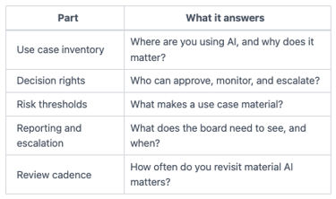 Those thresholds should be simple enough to apply in a meeting. If management can't tell whether a use falls inside or outside board oversight, your model is too vague. This is the same logic used in boards setting technology risk appetite, where thresholds matter more than slogans.