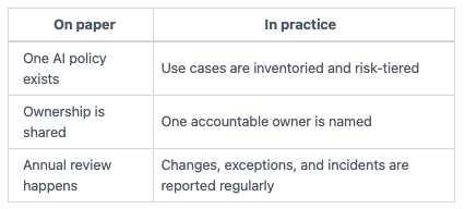 An AI policy without working controls is like a fire alarm with no one assigned to respond.