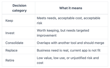 Use a scoring model that helps you decide what to keep, retire, replace, consolidate, or modernize