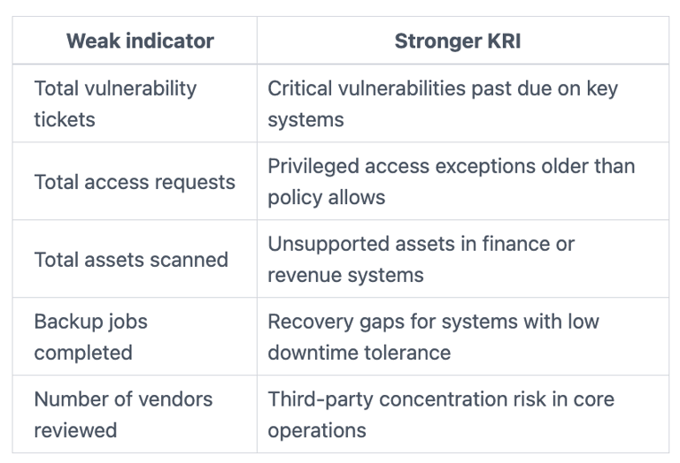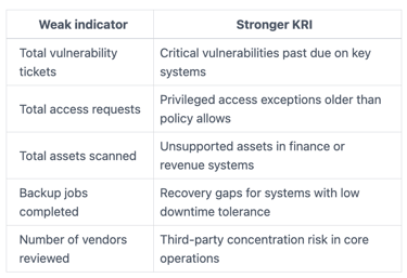 Weak KRIs often measure workload with little context. Raw ticket volume is a common example. So are total alerts, total scans, or total patches applied. Those numbers may matter to the team, but they do not tell you enough about enterprise risk.