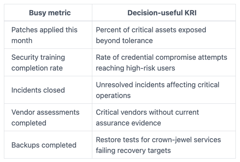 For example, "patches applied" is activity. "Percent of critical internet-facing assets exposed beyond tolerance for more than 15 days" is closer to a real KRI. One count shows work. The other shows exposure against a limit.