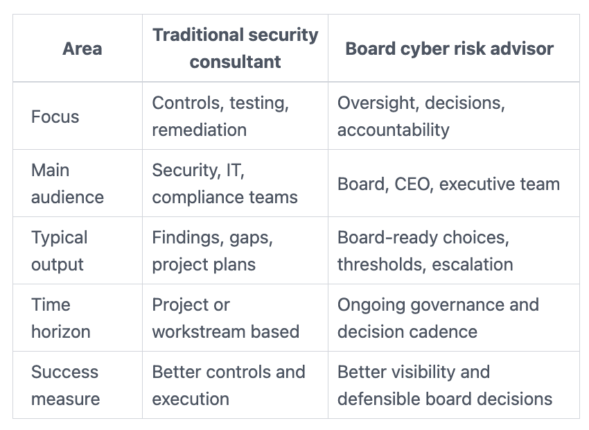 If your main issue is control design, testing, or technical execution, a traditional security consultant may be the right answer. If your main issue is board visibility, management accountability, and decision quality, a board cyber risk advisor is usually what you need most.