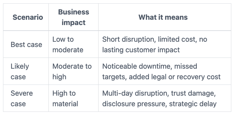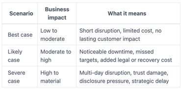A ransomware event is not just a malware issue. It may mean five days of billing disruption, delayed shipments, contract penalties, and missed quarterly targets. Weak third-party controls are not just a vendor problem. They may mean customer churn, regulatory review, or slowed integration after an acquisition.