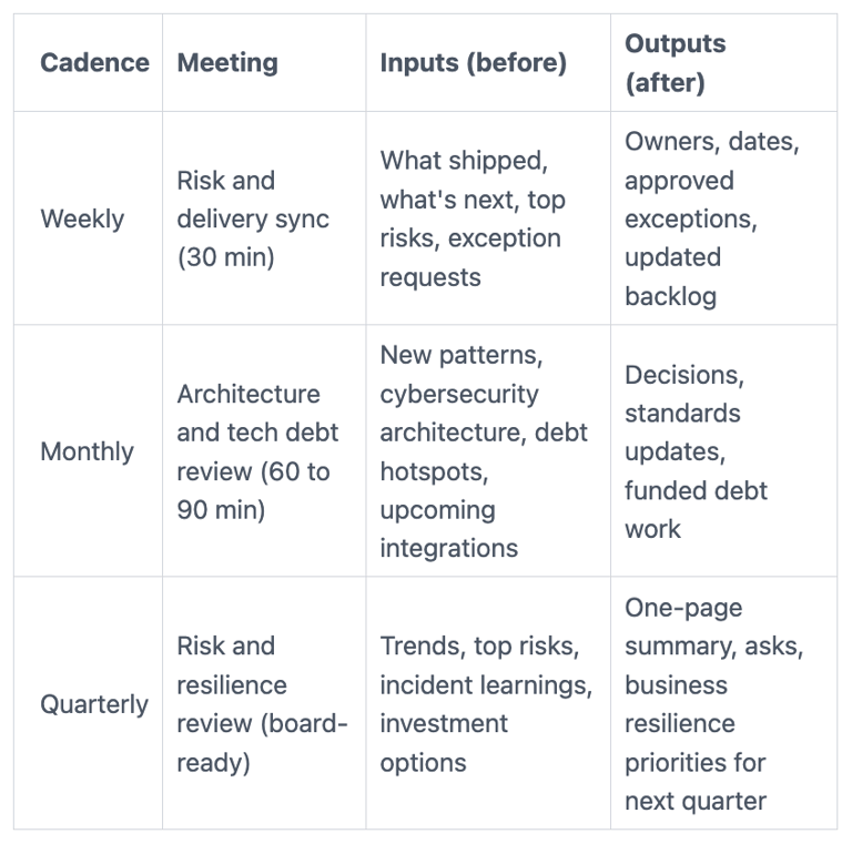 Second, keep the attendees small. CTO or delegate, CISO or delegate, the engineering lead for the hottest work, and someone who owns delivery planning. Everyone else can read the notes.