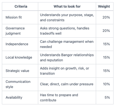 Before you review names, define the need in plain language. Do you need stronger financial oversight? Better succession judgment? More experience in healthcare, compliance, fundraising, cyber risk, or growth strategy? If you skip this step, you will hire for chemistry and hope it works out later.