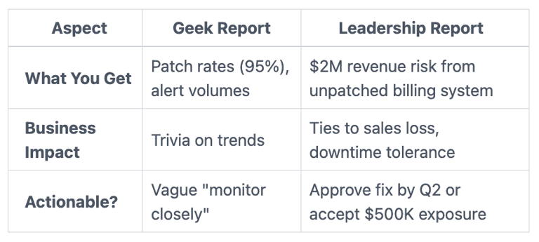 You fix it with business-focused reports. Demand risks in dollars and downtime, not data dumps. Set clear escalation paths. Your oversight sharpens. Decisions speed up. Governance works.