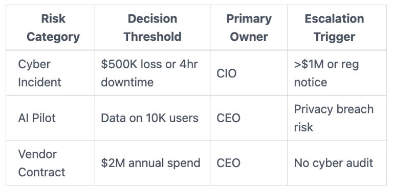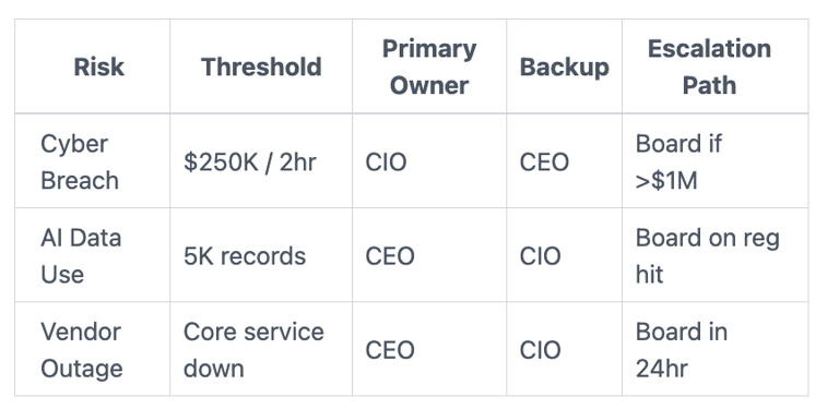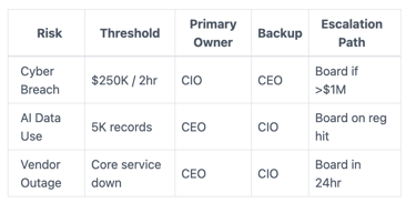 Does it cover AI risks? Yes. List pilots. Set data thresholds. CEO owns first. Escalates on scale.
