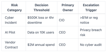This table sets context. You approve bounds. CIO handles inside them. Board steps in on triggers.