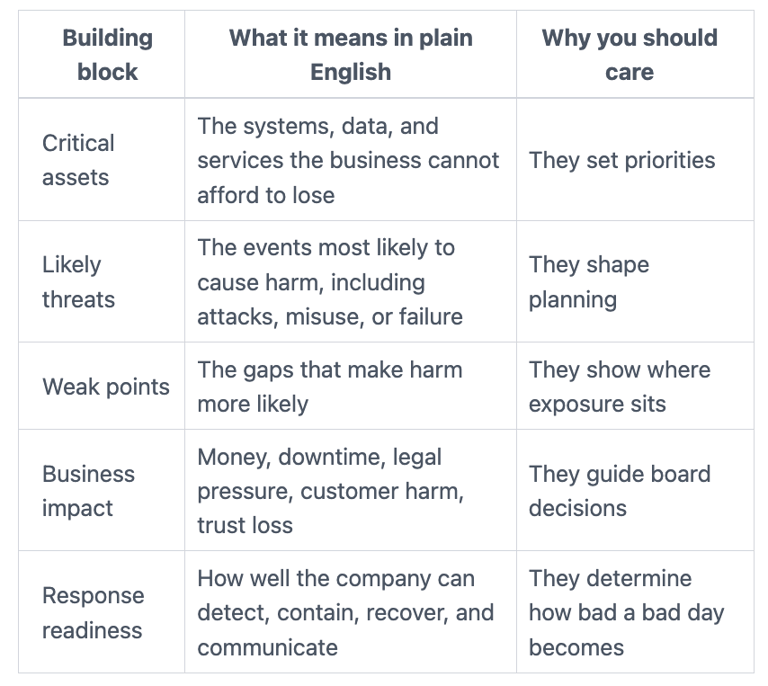Cyber risk is the chance that technology, data, systems, vendors, or digital processes fail, are attacked, or are misused in ways that hurt the business. That includes hostile acts, but it also includes weak recovery, bad access control, poor vendor dependence, and fragile operations.