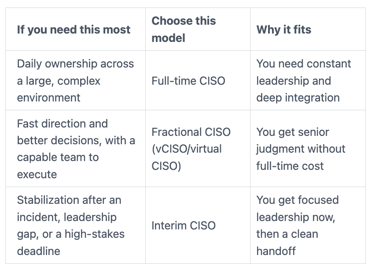 Choose a fractional CISO when you need executive decisions and a plan, but you don't need a full-time leader in the building every day.