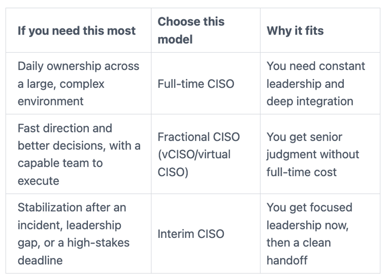 Not every organization needs a full-time Chief Information Security Officer right away. The right CISO model depends on urgency, complexity, and how much internal execution muscle you already have.