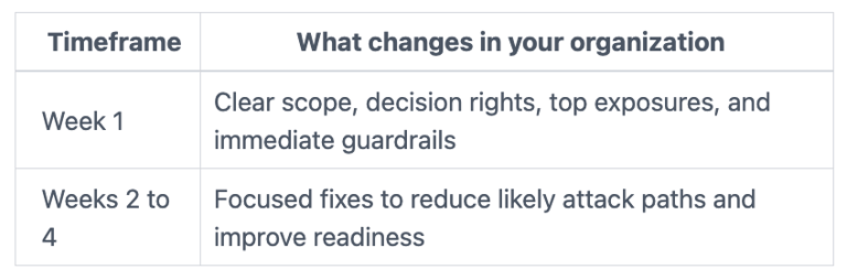 How fast can you start seeing risk reduction? You can see meaningful change in the first two weeks, especially in access, backups, and decision clarity. Bigger program shifts usually take 30 to 90 days.