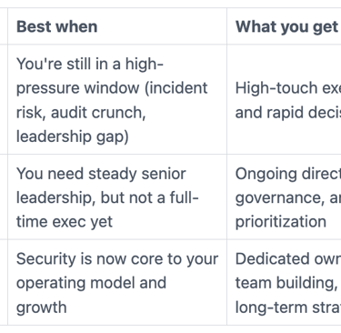 If you're continuing an intense stabilization period, consider an interim security executive model so you don't lose momentum mid-stream. If you're ready to shift to ongoing leadership and discipline, Fractional CISO can keep progress moving without forcing a rushed permanent hire.