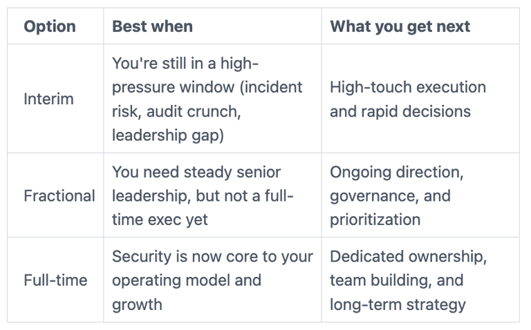 Decide the right next step: interim, fractional, or full-time CISO leadership