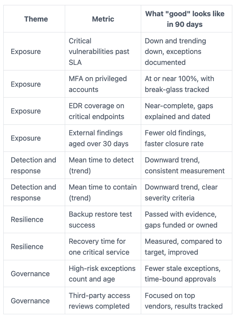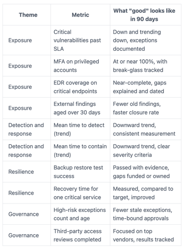 Pick a small scorecard (8 to 12 metrics) that covers exposure, response speed, recovery strength, and governance.