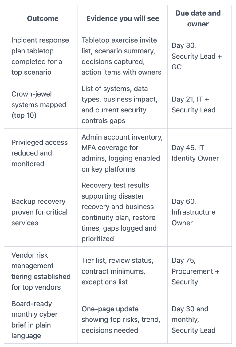 By day 30, expect triage and clarity: top risks ranked, baseline metrics established, and the most dangerous exposure reduced (often identity, remote access, backups, and escalation paths). By day 60, you should see plans turning into routines, plus a few early wins with evidence. By day 90, you want repeatable governance that fosters digital trust, stable reporting, and measurable improvement you can defend.
