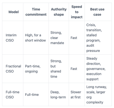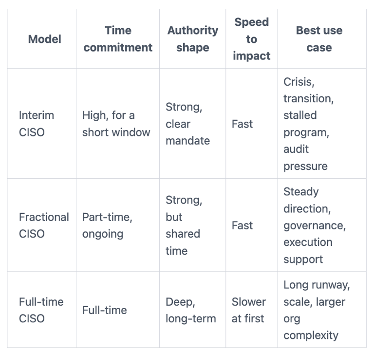 Don't confuse interim with fractional: Interim is often higher-intensity and time-bound, while Fractional CISO support tends to be ongoing and part-time.