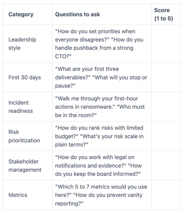 If you want a CEO-centered lens for your process, use this guide on how a CEO can vet a CISO. For a tighter interview structure, pull from these CISO interview questions.