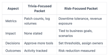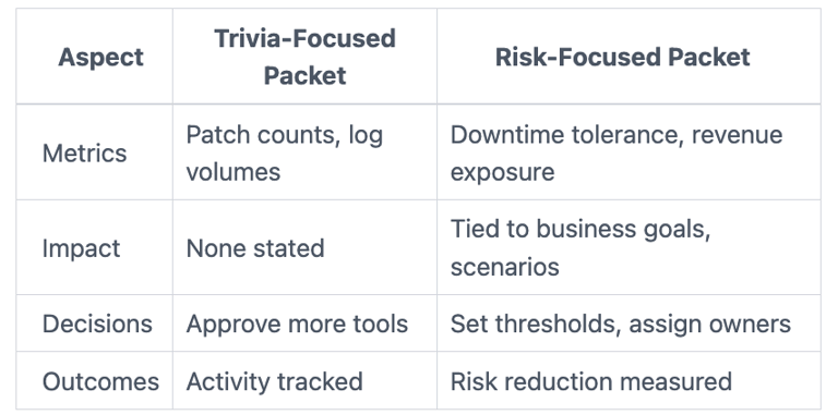 Strong packets stay concise. Impact leads. Risk heat maps tie to appetite. Downtime thresholds clear. Ownership named per gap.