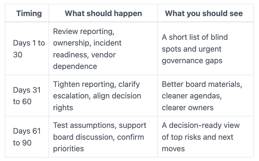 The first 90 days should not feel like a long audit. You should see visible progress early. The advisor will usually review reporting, governance structure, decision rights, incident readiness, major dependencies, and the way management currently describes cyber risk.