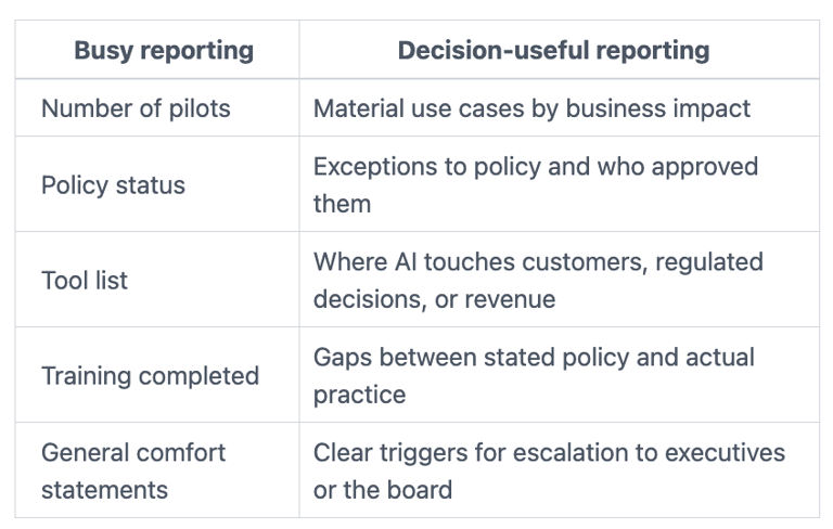 Busy updates don't help. You need visibility into material use cases, risks, exceptions, and what decisions need leadership attention.