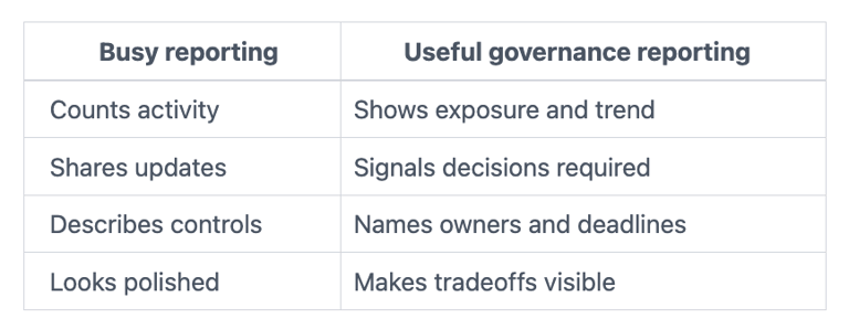 Good governance needs challenge built into the format. You need to see unresolved exposure, exceptions nearing expiry, dependencies that could fail together, and areas where management needs board air cover or board pressure.