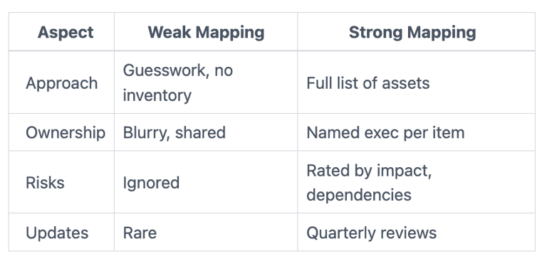 How do you measure mapping success? Fewer surprises. Clear owners. Incident response uses the map. Track updates completed.